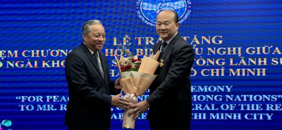 (HTV) – Liên hiệp các tổ chức hữu nghị TP.HCM đã tổ chức trao kỷ niệm chương Vì hòa bình, Hữu nghị giữa các dân tộc cho ông Kho Ngee Seng Roy – Tổng lãnh sự Singapore tại TP.HCM.
