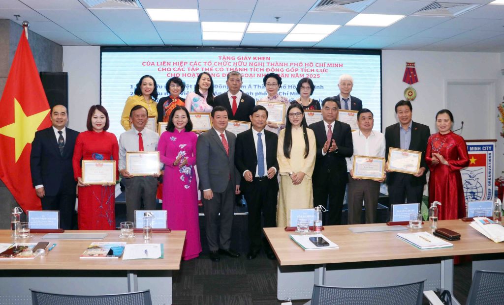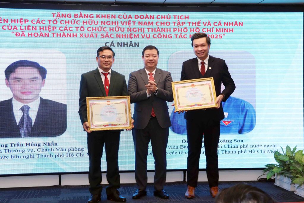 Lãnh đạo Thành phố và Lãnh đạo Liên hiệp trao tặng Giấy khen của Liên hiệp các tổ chức hữu nghị Thành phố Hồ Chí Minh cho các tập thể có thành tích đóng góp tích cực cho hoạt động đối ngoại nhân dân năm 2025