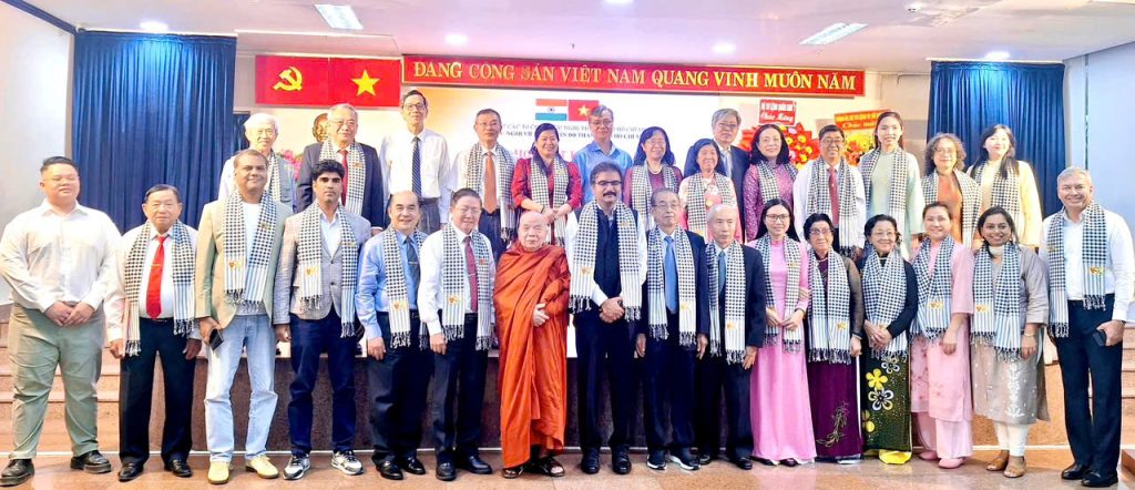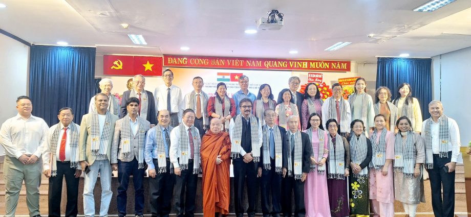 Các đại biểu cùng chụp ảnh lưu niệm với chiếc khăn rằn truyền thống của đồng bào Nam Bộ. Trên mỗi chiếc khăn là logo mới của Hội Hữu nghị Việt Nam – Ấn Độ Thành phố Hồ Chí Minh (VIFA), đánh dấu sự phát triển và mở rộng của Hội Hữu nghị sau khi sáp nhập tỉnh thành