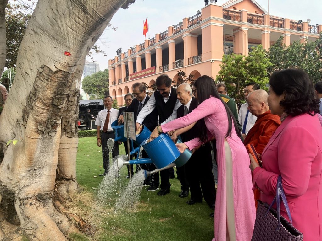 Các đại biểu cùng nhau tưới cây bồ đề – món quà của Cố Tổng thống Ấn Độ Ramaswamy Venkataraman trao tặng từ năm 1991
