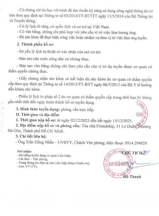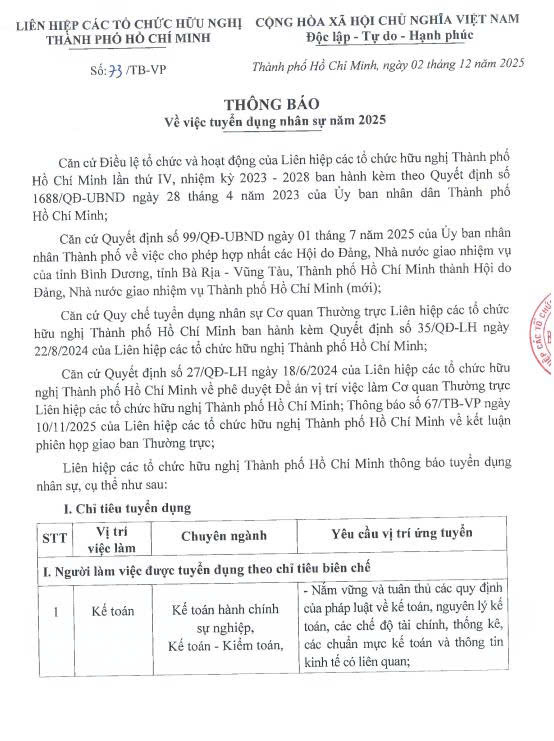 THÔNG BÁO VỀ VIỆC TUYỂN DỤNG NHÂN SỰ CỦA LIÊN HIỆP CÁC TỔ CHỨC HỮU NGHỊ THÀNH PHỐ HỒ CHÍ MINH NĂM 2025