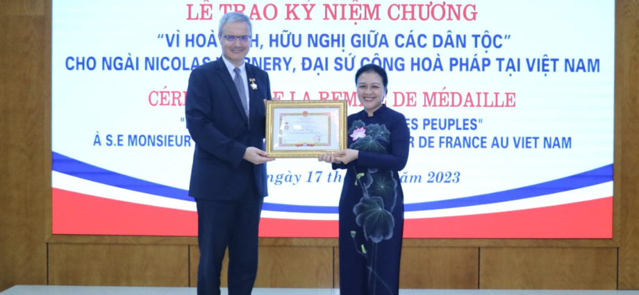 “Hoạt động hợp tác trong nhiều lĩnh vực giữa hai nước đã diễn ra phong phú, sôi động, hiệu quả trong nhiệm kỳ hoạt động của Đại sứ Nicolas Warnery tại Việt Nam. Nhưng những thành tích nêu trên cũng chưa đủ để thể hiện hết những đóng góp của Đại sứ Nicolas Warnery đối với quan hệ hai nước. Kỷ niệm chương “Vì hòa bình, hữu nghị giữa các dân tộc” là phần thưởng cao quý nhất của Liên hiệp các tổ chức hữu nghị Việt Nam để ghi nhận và tôn vinh những đóng góp quý báu của Đại sứ Nicolas Warnery trong việc củng cố, thúc đẩy sự hiểu biết lẫn nhau, quan hệ hữu nghị, giao lưu và hợp tác giữa nhân dân hai nước Việt Nam và Pháp”, Chủ tịch Nguyễn Phương Nga nói.